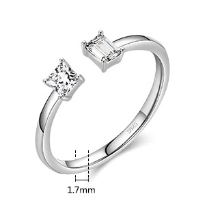 Kétféle formájú ragyogó cirkónia kő is díszítik ezt a modern, állítható méretű ezüst gyűrűt.