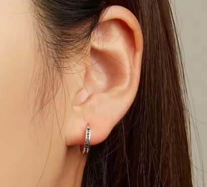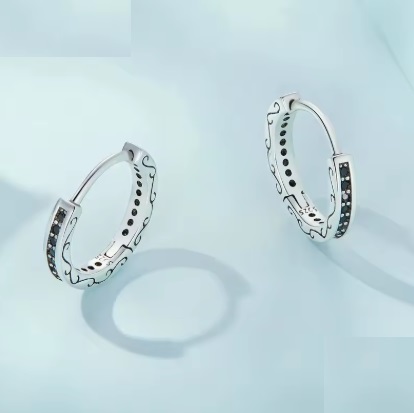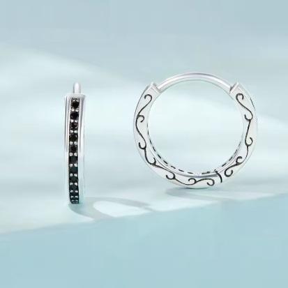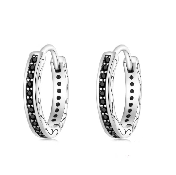 Különleges, fekete cirkon kövekkel körben kirakott ez a karika ezüst fülbevaló. Belső átmérője 10 mm. Oldalai is finoman kidolgozott mintásak. Anyaga: 925 ezüst. Drágakő: cirkon.