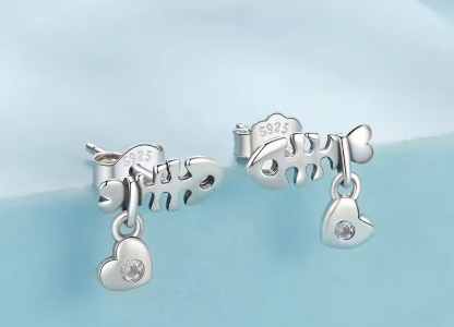 Egy halcsontváz és egy kis lógós szívecske díszítik ezt az ezüst fülbevalót. Mókás és trendi egyszerre! Anyaga: 925 ezüst. Drágakő: cirkon.