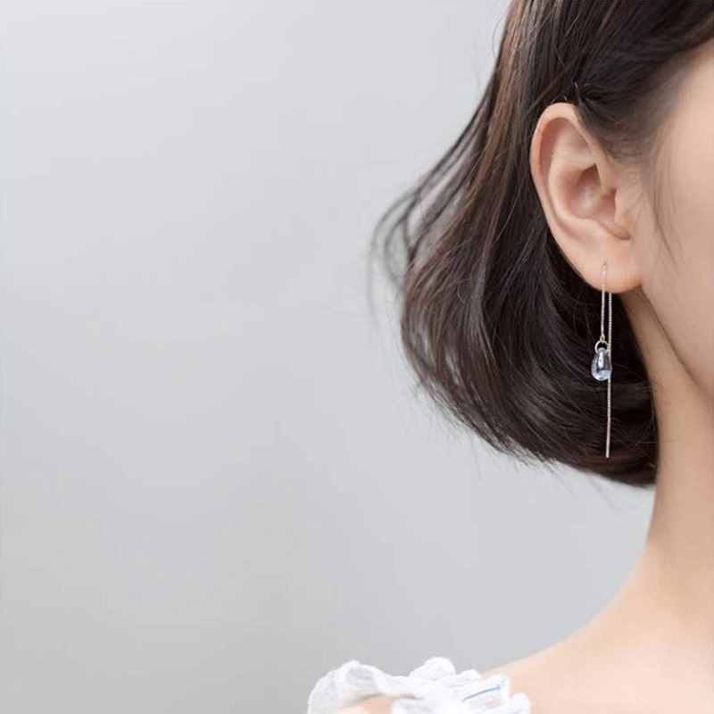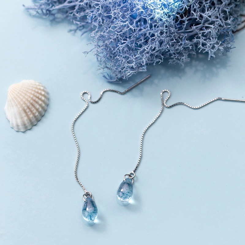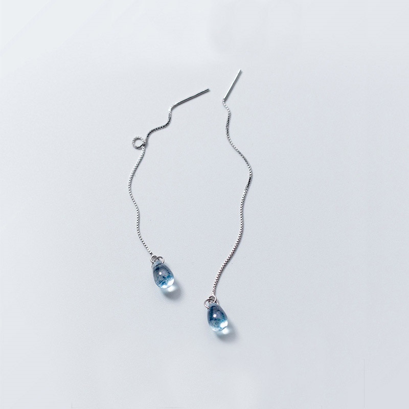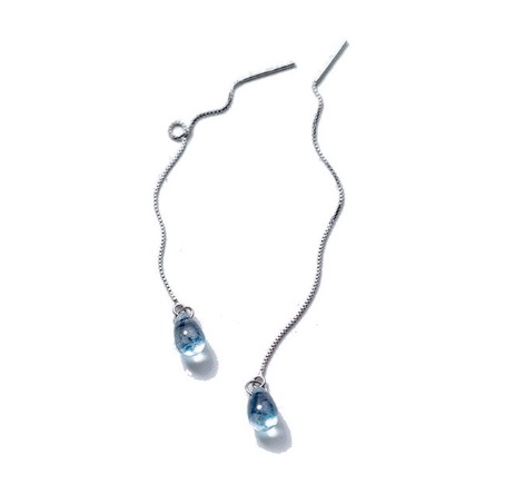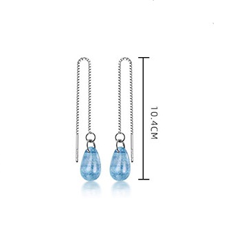 Egy élettel teli vízcseppet formáz ez a szép kék kristály ezen az állítható hosszúságú ezüst fülbevalón.