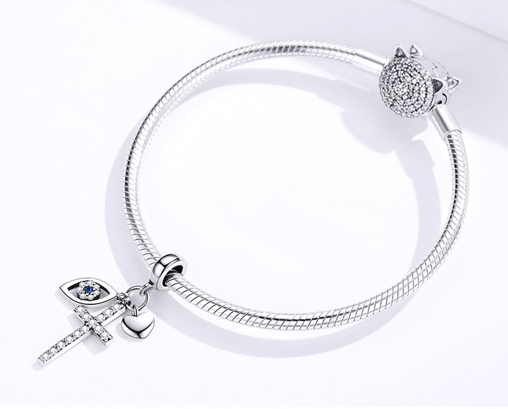 Egy kereszt, egy szem és egy szív díszíti ezt az ezüst charmot. Medálnak is használható. Méretei: 3,0 x 1,0 cm. Charm gyűjtő karkötőkkel kompatibilis. Anyaga: 925 ezüst. Drágakő: cirkon.