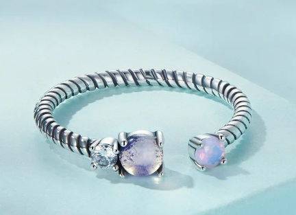 Misztikus színekben csillognak a cirkónia kövek ebben a nyitott, állítható méretű gyűrűben. Az ezüst csavart kialakítású.