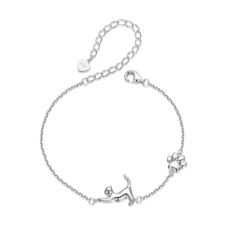 Egy cuki macska és egy tappancs minta díszíti ezt az ezüst karkötőt. Hossza 15 cm plusz 6cm állítható rész. Anyaga: 925 ezüst.