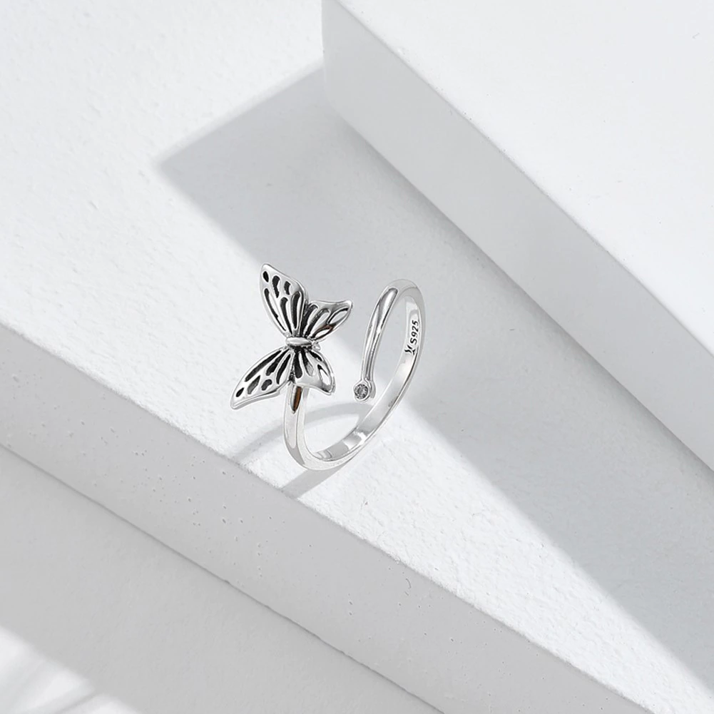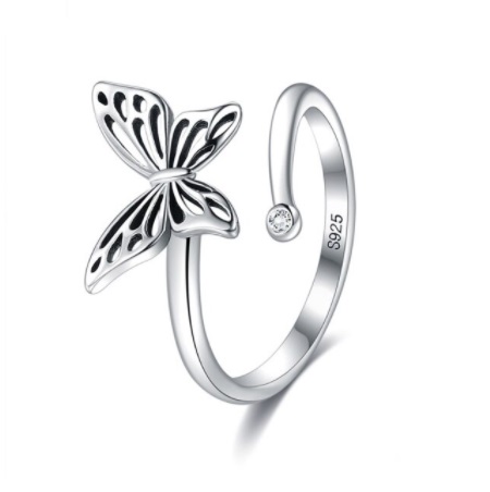 Egy szépséges pillangó és egy kis csillogó cirkon kő díszítik ezt az állítható méretű ezüst gyűrűt.