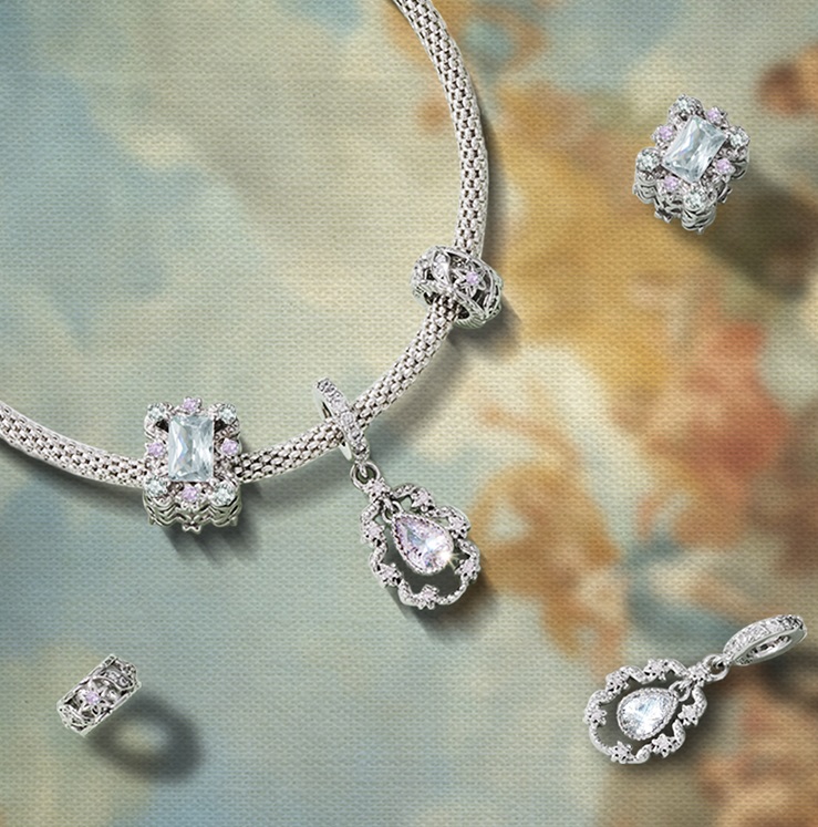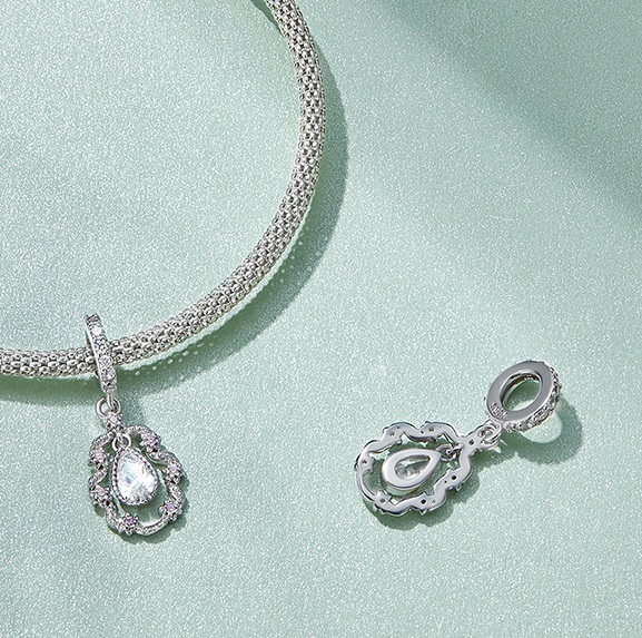Egy rokokó stílusú függő díszíti ezt az ezüst charmot. A külső kövek halvány rózsaszínek, a belső csepp alakú cirkon kő fehér. Medálnak is használható. Méretei: 2,2 x 1,7 cm. Charm gyűjtő karkötőkkel kompatibilis.