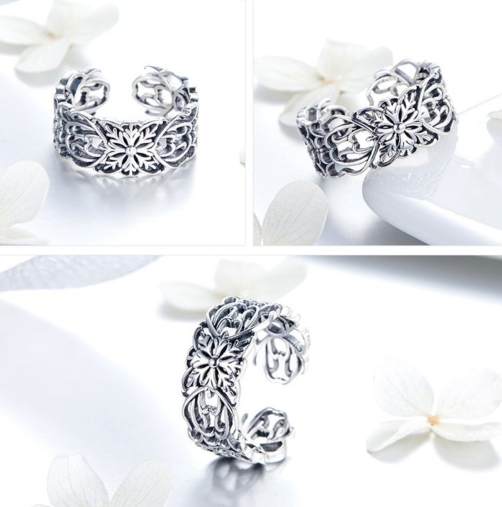 Vastag, 8 mm-es szélességű, ez az állítható méretű, vintage rokokó stílusú, virág és girland motívumokkal díszített ezüst gyűrű.
