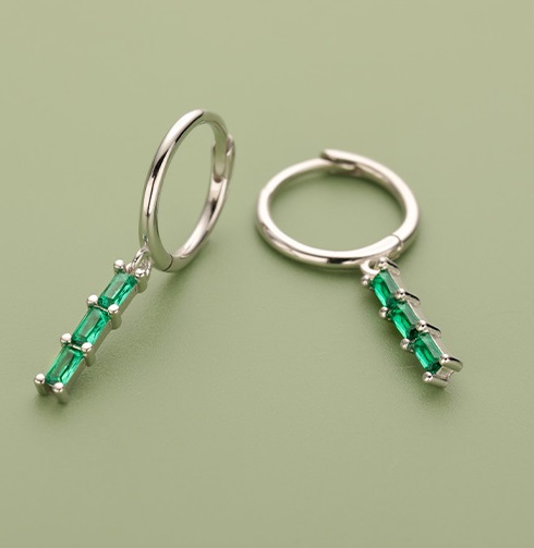 Intenzív, fűzöld cirkónia kövekkel van kirakva ez a karika, ezüst fülbevaló. A karika belső átmérő 8,5 mm. A fülbevaló teljes hossza 24 mm. Anyaga: 925 ezüst. Drágakő: cirkon.